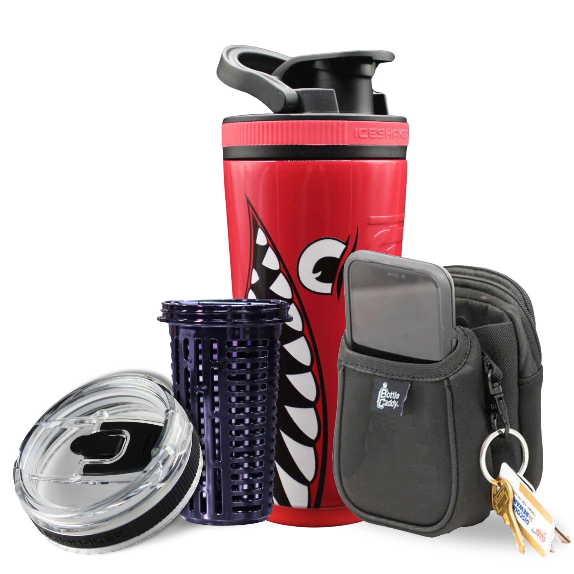 - 1 Bottle Caddy that slips onto the Ice Shaker & allows you to store your keys, phone, debit card, etc.